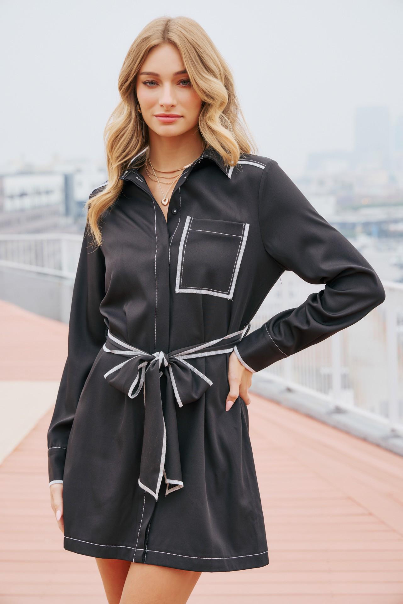 Sleek, tailored, and endlessly versatileâthis chic button-down mini dress is your new wardrobe essential. Designed in a soft poly-spandex blend, it features crisp long sleeves, contrast stitching, and a flattering belt that cinches the waist for definition.