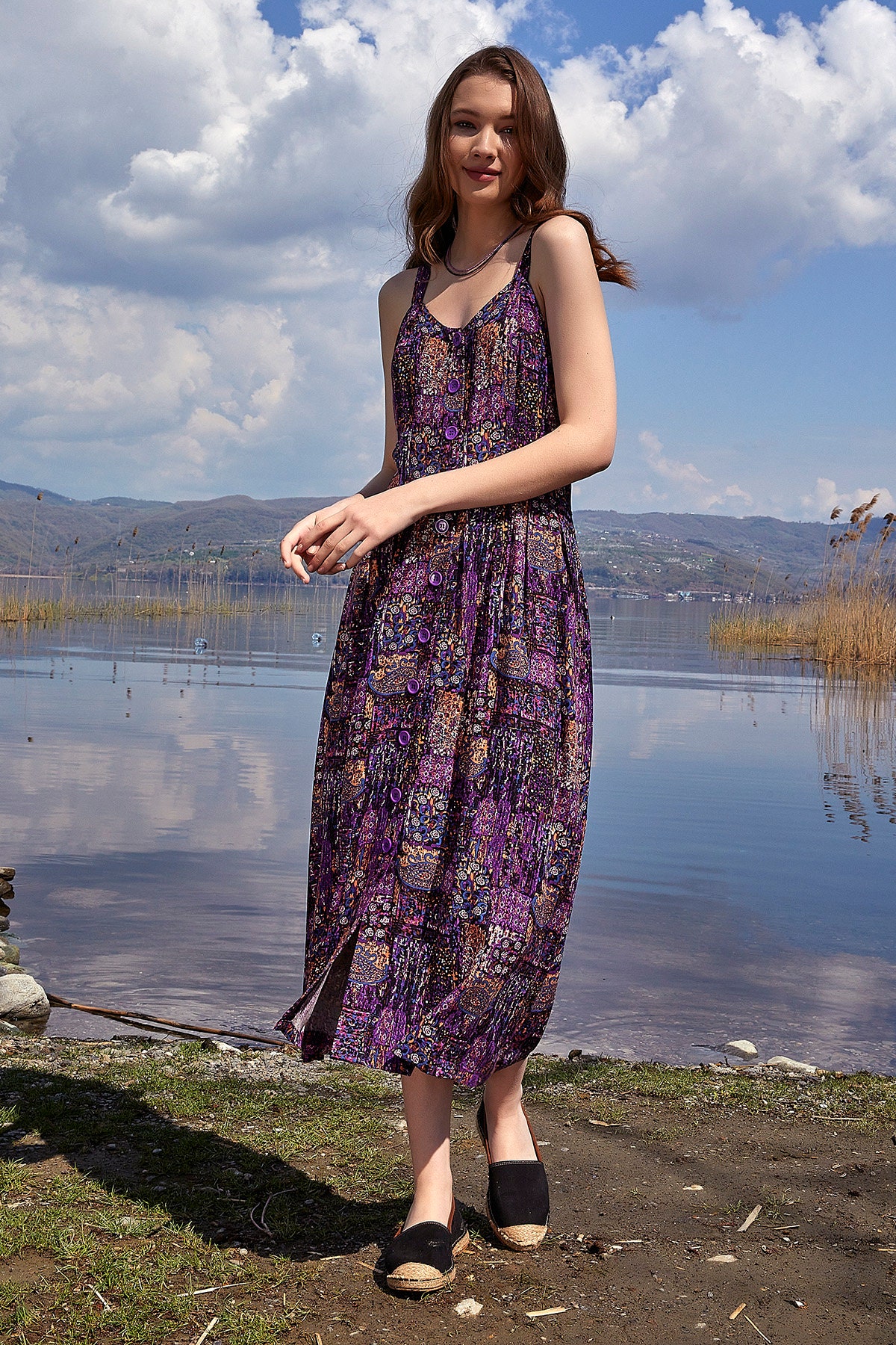 Bohemian Button Down Maxi Dress Wide Strap Purple